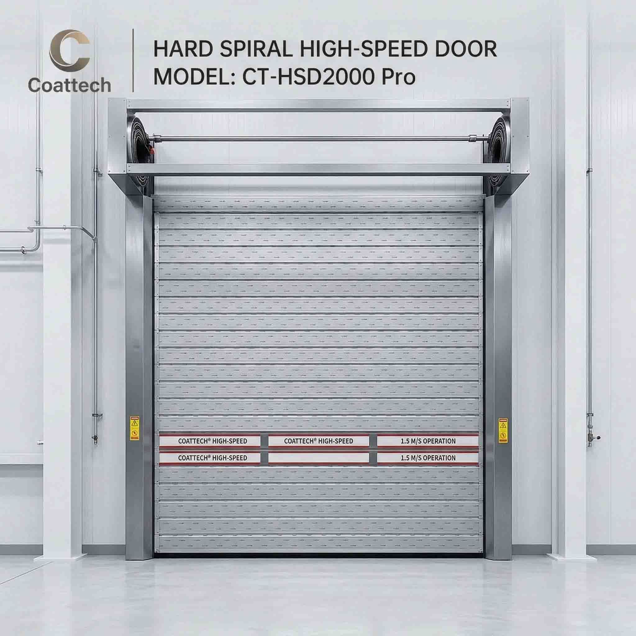 As portas espirais de alta velocidade da Coattech combinam segurança, isolamento e operação rápida (1.5-2.5m/s). Ao contrário das persianas tradicionais, nossa tecnologia de turbina garante espiralamento sem contato, estendendo a vida útil para mais de 1 milhão de ciclos. Ideal para cabines de pintura, salas limpas e logística de alto tráfego.